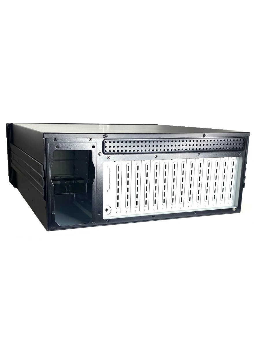 Промышленный компьютерный корпус AX61400TB, 4U, 14 слотов, 3 x 5.25" HDD, 1 x 3.5" HDD, 1 x 3.5" HDD (внутренний), 2 x USB, 1 x PS2, цвет - черный, без БП, 0...+40°C